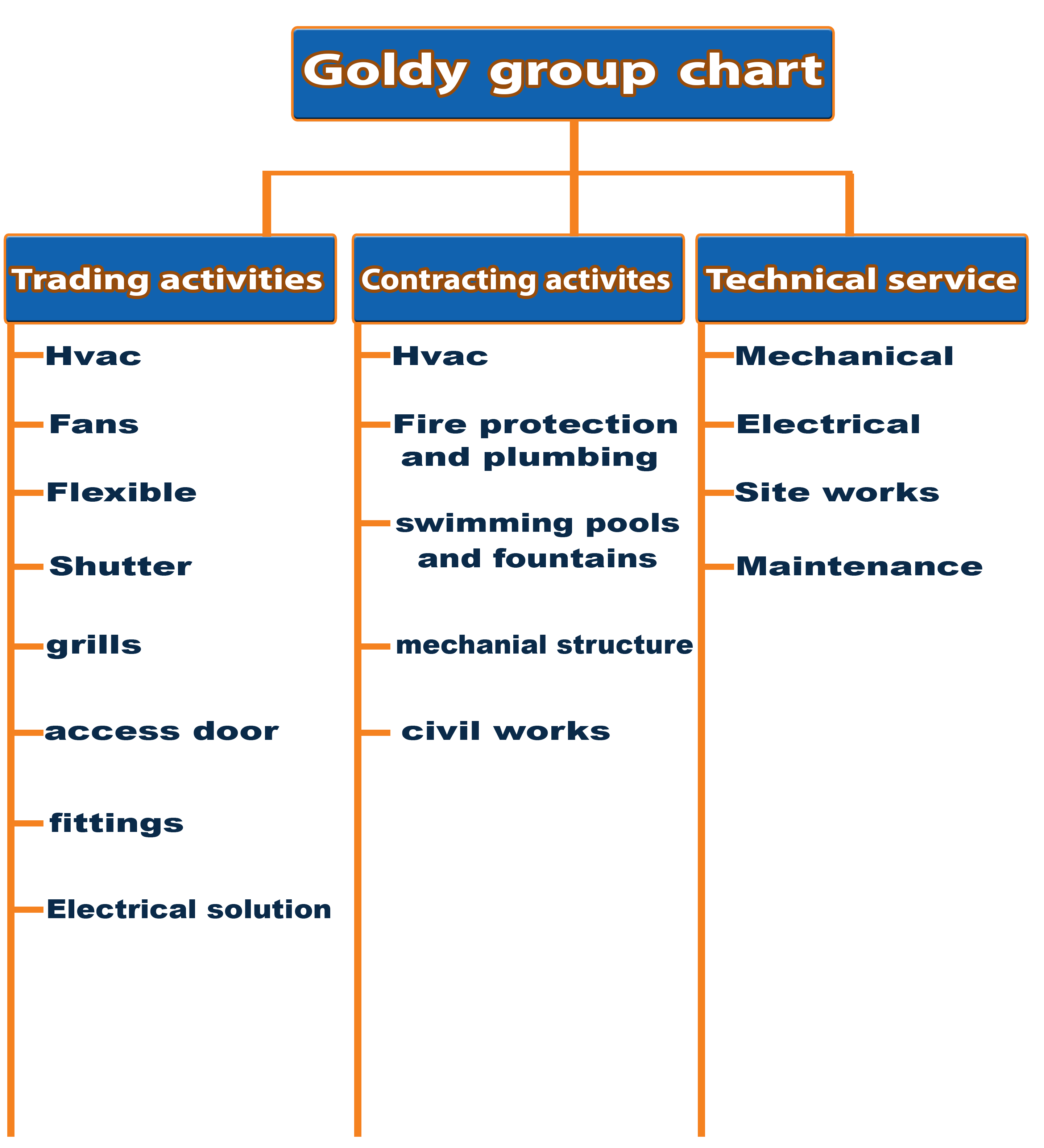 شركة مجموعة جولدي الهندسيه تأسست عام ٢٠٠٢ بداية من أعمال التهوية المركزيه ودخول الأقسام الأخرى التاليه ( تكييف - ألومنيوم - انشاءات) وفي صدد فتح فرع المصاعد والأعمال الكهربائيه والعوازل بأنواعها وتعاملنا مع أكثر من( ٨٥٠٠ ) موقع في جميع الانشطه ولا ندعي الأفضليه ولكن نترك الحكم لك أيها العميل بعد التعامل معنا وقد أسردنا بعد الأسماء التي تعاملنا معها في السيره الذاتيه ويشرفنا خدمتك